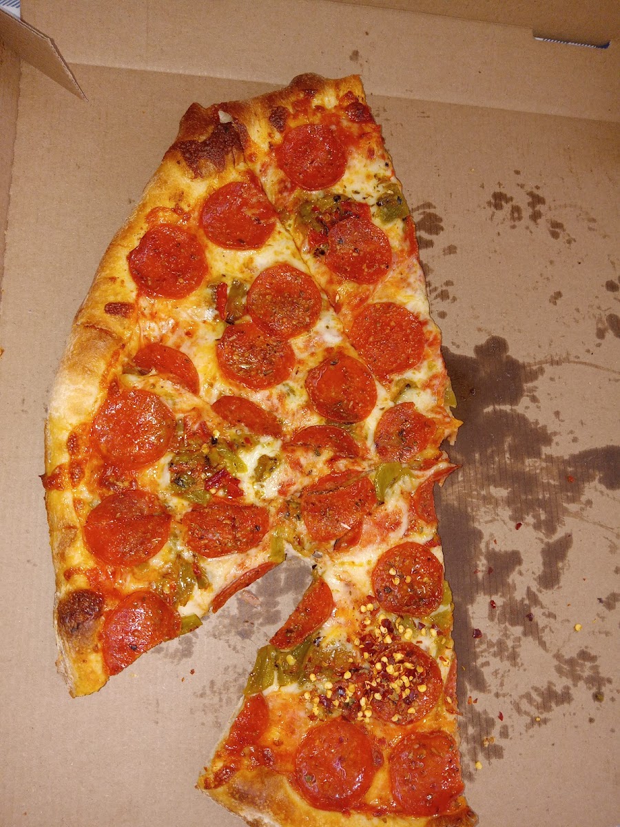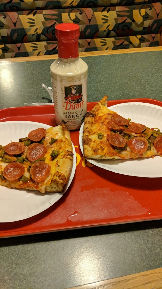 Went here on our drive thru and we always try to stop mainly for the RANCH dressing. It is the best I’ve ever had ever. Pizza is solid too. Nice crust not too chewy and great for leftovers. We got double pep and double green chiles and it was delicious. Right amount of cheese and cooked great. Picked it up nice and warm and got a salad too. It’s a better establishment than say a dominos or Pizza Hut and in between those and like a fancy sit down pizza place. I didn’t see a lot of people dining in but there’s plenty of tables and booths and an area where kids can watch pizza being made. Seems to be fairly clean and everyone was nice who worked there. Again. The ranch dressing. Get some.